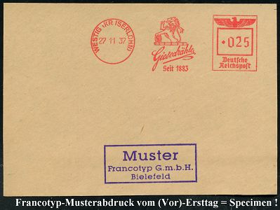 10954 | 35 € | PL-Raum 58 : WESTIG (KR ISERLOHN)/ Giesedrähte/ Seit 1883 1937 (27.11.) AFS-Musterabdruck Francotyp "Reichsadler" (Firmenlogo: Löwe mit Drahtrolle) glasklar gest. Francotyp-Musterblatt vom (Vor)-Ersttag !, selten!, vergl. Kat.-Nr. 10955-56 (Dü.E-5DGo) | ![]() ![]() | |