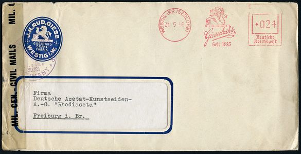 10956 | 28 € | PL-Raum 58 : WESTIG (KR ISERLOHN)/ Giesedrähte/ Seit 1883 1946 (31.5.) aptierter AFS Francotyp "Reichsadler" = entfernt = Notmaßnahme! (Firmen-Logo: Löwe mit Drahtrolle) + brit. Zensur-1K + Zensurstreifen: OPENED BY/MIl. CENS.-CIVIL MAIL (= Bonn),motivgl. Firmen-Bf.: J. H. RUD. GIESE, GUSSTAHL-DRAHT-FABRIK mit Prägerelief (Dü.E-13J-147o) | ![]() ![]() | |