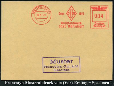 10957 | 35 € | PL-Raum 58 : WETTER (RUHR)/ Gegr. 1875/ CB/ Gußstahlwerk/ Carl Bönnhoff 1939 (19.5.) AFS-Musterabdruck Francotyp "Reichsadler" (Monogr.-Logo mit Stahlteil) glasklar gest. Francotyp-Musterblatt vom (Vor)-Ersttag !, selten! (Dü.E-5CGo) | ![]() ![]() | |