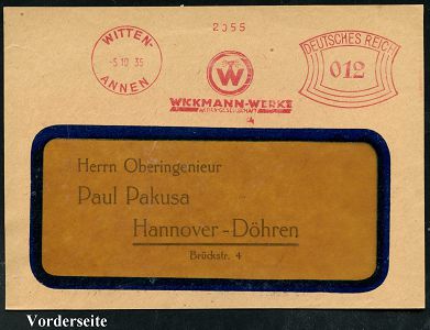 10963 | 16 € | PL-Raum 58 : WITTEN-/ ANNEN/ W/ WICKMANN-WERKE/ AG 1935 (5.10.) AFS Francotyp "Bogenrechteck" (Firmen-Monogr.-Logo mit Hand mit Blitzen = elktrotechn. Fabrik) Bedarfs-Vorderseite, vergl. Kat.-Nr. 10966, 10968, 10970-71 (Dü.E-1CAh) | ![]() | |