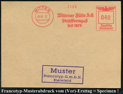 10965 | 35 € | PL-Raum 58 : WITTEN/ Wittener Hütte A.-G./ Stahlformguß/ seit 1879 1937 (19.10.) AFS-Musterabdruck Francotyp "Reichsadler" , glasklar gest. Francotyp-Musterblatt vom (Vor)-Ersttag !, selten! (Dü.E-5CGh) | ![]() ![]() | |