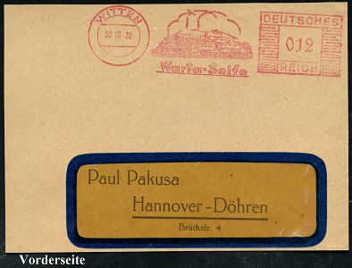 10967 | 14 € | PL-Raum 58 : WITTEN/ Warta-Seife 1939 (30.10.) AFS Francotyp "Mäanderrechteck" (Fabrik) Teil-Vorderseite (Dü.E-2CEo) | ![]() | |
