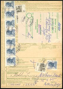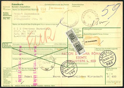 10942 | 15 € | PL-Raum 58 : SCHWELM 1 c 1974 (26.10.) viol. Anker-Registrierkassen-Paket-FS 13.00 (DM) 2 Abdrucke (21mm) + 1K-Segment: 583 SCHWELM 1/g + brauner Paketzettel: 583 Schwelm 1 (Mittebugspur) + ital. Paketmarke 400 L. (Mi.Pak 97) Ausl.-Paketkt. n. Rom, seltenes Porto! (Dü.H-1B) | ![]() | |