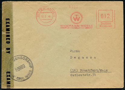 10970 | 30 € | PL-Raum 58 : WITTEN-ANNEN/ W/ WICKMANN-WERKE/ AG 1946 (12.2.) aptierter AFS Francotyp "Reichsadler" = entfernt = Notmaßnahme! (Monogr.-Logo mit Hand mit Blitzen = elektrotechn. Fabrik) + US-Zensur-1K: MILITARY CENSORSHIP/ 10989/ CIVIL MAILS + Zensurklebestreifen: EXAMINED BY = Offenbach (Rie. A-1, A-101), Inl.-Zensur-Bf. n. Ffm. (Dü.E-13 R-129h = seltene Type!) | ![]() | |
