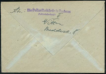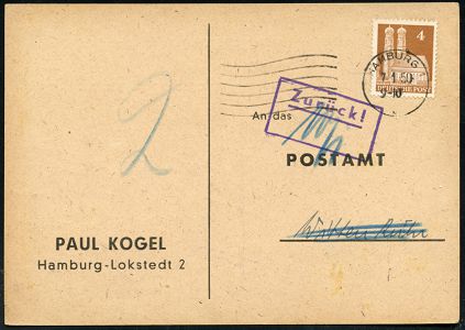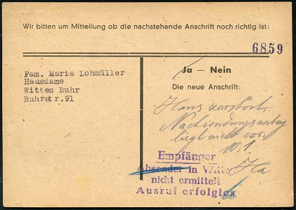 10974 | 18 € | PL-Raum 58 : Witten 1950 (7.1.) viol. 4L: Empfänger/Absender in Witten/nicht ermittelt/Ausruf erfolglos rs. + hs. Zusatz: "Haus zerstört.." + vs.viol. Ra.2: Zurück!, seltene Retour-Anschriftenprüfung n. Hamburg Anschriftenprüfung! (Mi.74 eg/EF) | ![]() ![]() | |