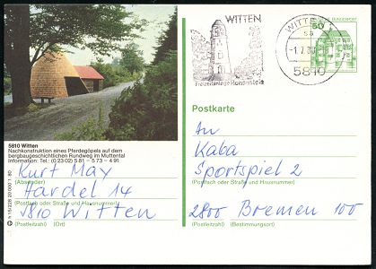 10977 | 14 € | PL-Raum 58 : 5810 WITTEN 1/ sa/ Freizeitanlage Hohenstein 1980 (1.7.) MWSt (= Hohensteinturm) auf ortsgl. BiP 50 Pf. Burgen, grün: 5810 Witten.. Pferdegöpel auf dem bergbaugeschichtl. Rundweg im Mutteltal (Mi.P 130/h 1.228) Bedarfs-Kt., seltene Kombination! | ![]() | |