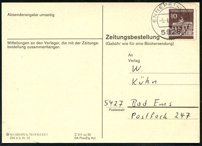 10759 | 25 € | PL-Raum 58 : 5828 ENNEPETAL 13/ a 1971 (5.1.) 1K -Segment auf EF 10 Pf. Brandenbg.Tor auf "Zeitungsbestellung" = seltene, niedrigste Portostufe u. seltene Versandart! (Mi.506 EF) | ![]() ![]() | |