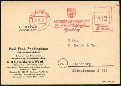 10769 | 25 € | PL-Raum 58 : GEVELSBERG/ SCHEREN-u.STANZENBAU/ P.F.Peddinghaus 1945 (6.12.) aptierter AFS Francotyp "Reichsadler" = entfernt = Notmaßnahme! (Firmenlogo mit Kleeblatt) Firmen-Fern-Kt., Text über Materialmangel, vergl. Kat.-Nr. 10765, 10770 (Dü.E-13 J-129o) | ![]() | |