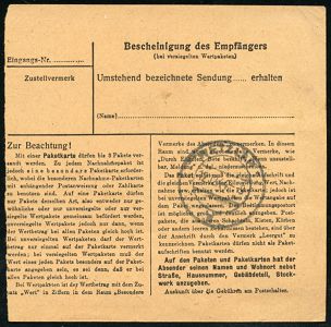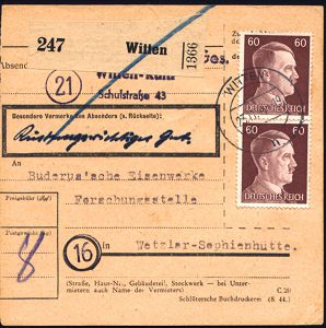 10969 | 18 € | PL-Raum 58 : WITTEN/ n 1944 (23.11.) 2K-Steg + schw. Paketzettel: Witten + hs. Vermerk "Rüstungswichtiges Gut" + zugestempelte PLGZ (21) bzw. (16) für Destination Wetzlar, klar gest. Inl.-Paketkarte n. Wetzlar, rs. AS. (Mi.797 MeF) | ![]() ![]() | |