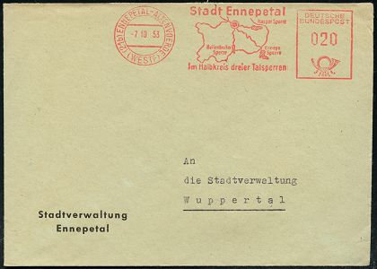 10757 | 14 € | PL-Raum 58 : (21b) ENNEPETAL-ALTENVOERDE/ (WESTF)/ ..Im Halbkreis dreier Talsperren 1953 (7.10.) AFS Francotyp (Landkarte mit 3 Talsperren) klar gest. Kommunalbf. (Dü.E-23CG) | ![]() | |