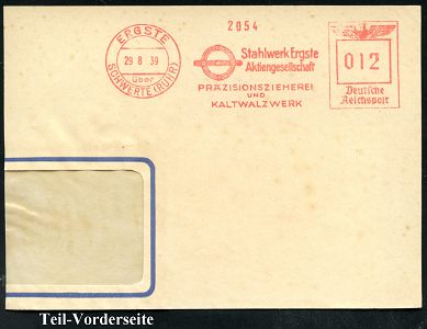 10762 | 15 € | PL-Raum 58 : ERGSTE/ über/ SCHWERTE (RUHR)/ Stahlwerk Ergste/ AG/ PRÄZISIONSZIEHEREI/ U./ KALTWALZWERK 1939 (29.8.) AFS Francotyp "Reichsadler" = PSt.I-Typ , klar gest. Teil-Vorderseite, vergl. Kat.-Nr. 10761 (Dü.E-5CGh) | ![]() | |