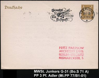 10824 | 18 € | PL-Raum 58 : ISERLOHN/ **III/ Benutzt/ die/ Luftpost! 1928 (28.1.) MWSt = Junkers "G-21" auf PP 5 Pf. Adler "Drucksache", braun (Mi.PP 77/A 3 rs. philatel. Werbetext) klar gest. Inl.-Drs.-Karte (Bo.S 71 A) | ![]() | |