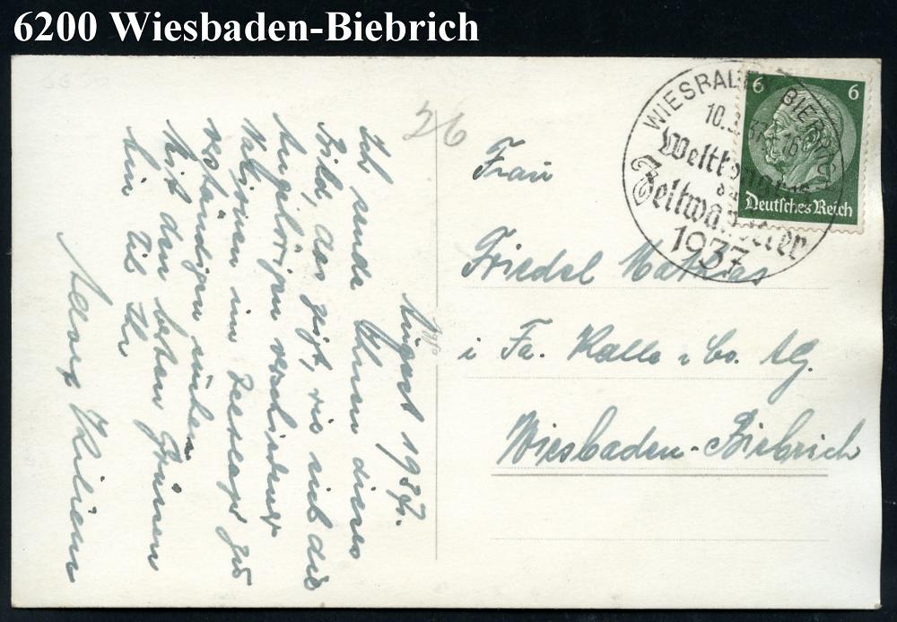 1291 | 30 € | 6200 Wiesbaden Sonder- und Hand-Werbestempel : WIESBADEN-BIEBRICH/ Weltkongreß/ der/ Zeltwanderer 1937 (10.8.) SSt auf seltener, privater Foto-Sonder-Kt.: Kongreßhaus mit Hakenkreuz-Flaggen m. entspr. Text!, Bedarf, (Bo.39/ Bo. 10.8. unbekannt!) | ![]() ![]() | |