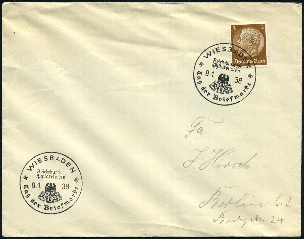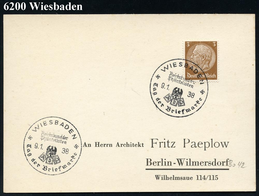 1294 | 18 € | 6200 Wiesbaden Sonder- und Hand-Werbestempel : WIESBADEN/ RdPh/ Tag der Briefmarke 1938 (9.1.) SSt (RdPh-Logo) klar gest. Inl.-Bf. (Bo.42) | ![]() | |