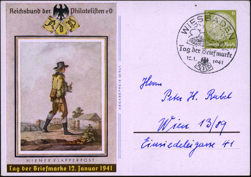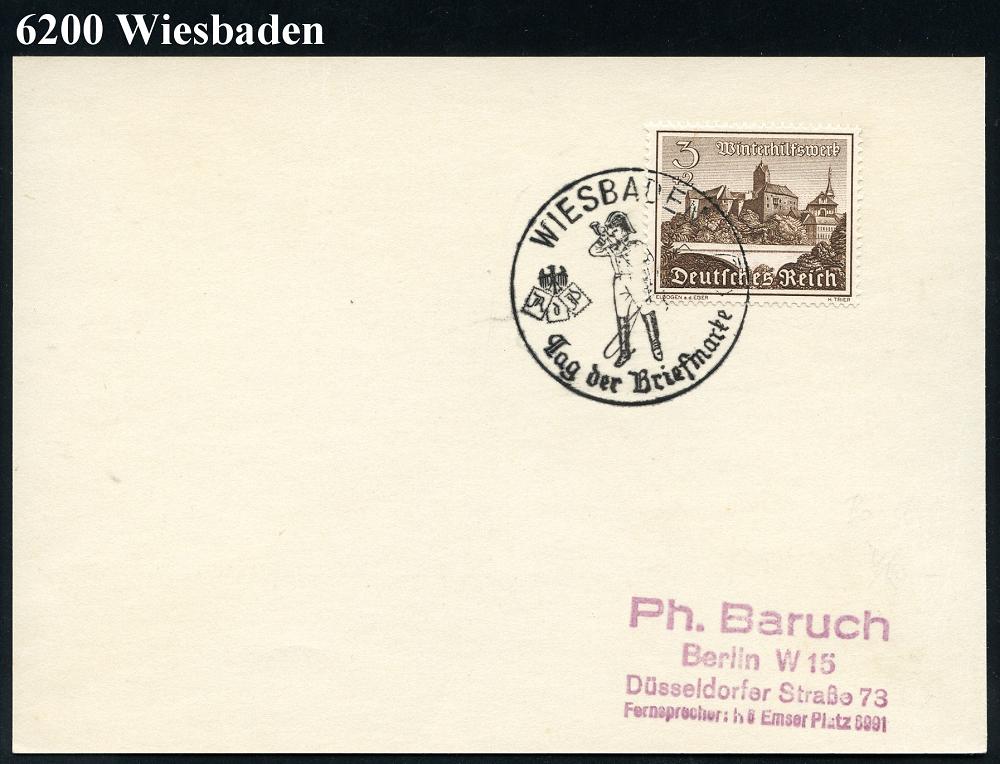 1297 | 12 € | 6200 Wiesbaden Sonder- und Hand-Werbestempel : WIESBADEN/ Tag d.Briefmarke 1940 (7.1.) SSt (Postillon) auf Inl.-Karte (Bo.50) | ![]() | |