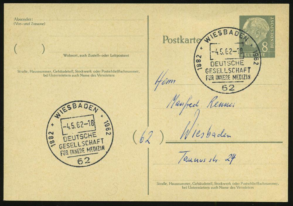 1311 | 12 € | 6200 Wiesbaden Sonder- und Hand-Werbestempel : 62 WIESBADEN/ 1882 1962/ DEUTSCHE/ GESELLSCHAFT/ FÜR INNERE MEDIZIN 1962 (4.5.) SSt auf Orts-P 8 Pf. Heuss I (P 30) klar gest.! (Bo.116) | ![]() | |