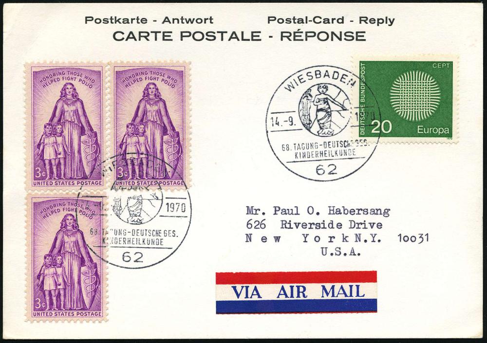 1316 | 18 € | 6200 Wiesbaden Sonder- und Hand-Werbestempel : 62 WIESBADEN/ 68.TAGUNG DEUTSCHE GES./ KINDERHEILKUNDE 1970 (14.9.) SSt = gewickeltes Baby 2x auf MiF BRD + USA 3x 3 C. "Kampf der Kinderlähmung" (3x Mi.709) zulässige Übersee-Flp.-Antwortkt. in die USA, Unikat! (Bo.199) | ![]() | |