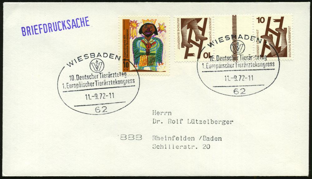 1321 | 12 € | 6200 Wiesbaden Sonder- und Hand-Werbestempel : 62 WIESBADEN 1/ 10.Europ.Tierärztetag/ 1.Europ.Tierärztekongress 1972 (11.9.) SSt (Logo) 2x klar gest. Inl.-Bf. (Bo.217 , 1. Tag) | ![]() | |
