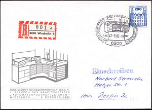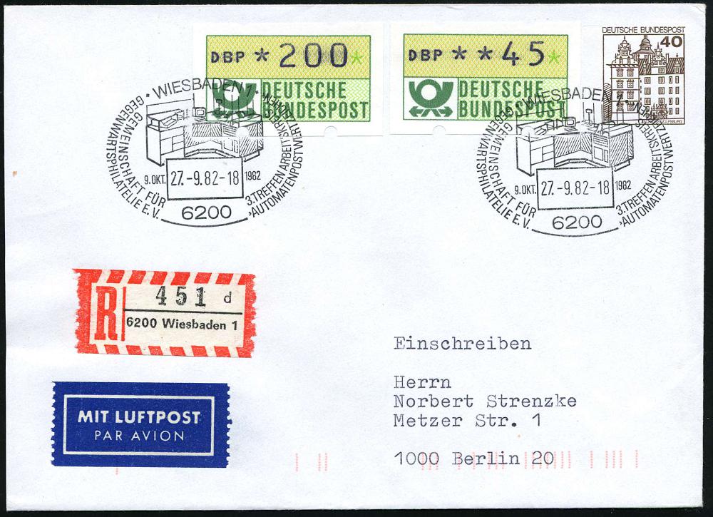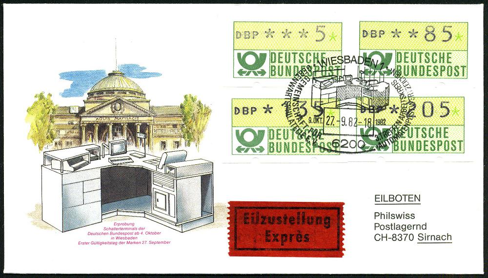 1324 | 15 € | 6200 Wiesbaden Sonder- und Hand-Werbestempel : 6200 WIESBADEN 1/ ..3.TREFFEN ARBEITSKREIS/ AUTOMATENPOSTWERTZEICHEN 1982 (27.9.) SSt = Versuchs-Schalter-Terminal auf ATM 5 Pf., 85 Pf., 135 Pf. u. 205 Pf. auf motivgl. Ausl.-Eil-SU. in die Schweiz, rs. AS. (Mi.1) | ![]() | |