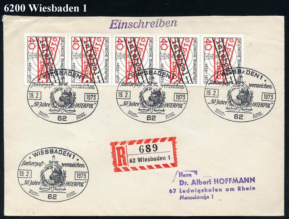 1322 | 16 € | 6200 Wiesbaden Sonder- und Hand-Werbestempel : 62 WIESBADEN 1/ .."50 Jahre INTERPOL"/ ERST-/ AUSG. 1973 (19.2.) SSt (Polizei-Logo) 4x auf 5er-Streifen 40 Pf. Interpol ,Inl.- R-FDC (Mi.759 MeF) | ![]() | |