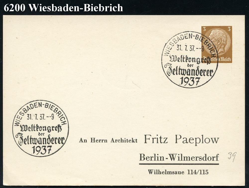 1289 | 16 € | 6200 Wiesbaden Sonder- und Hand-Werbestempel : WIESBADEN-BIEBRICH/ Weltkongreß/ der/ Zeltwanderer 1937 (31.7.) SSt vom Eröffnungstag , auf PP 3 Pf. Hindenbg., braun (Fritz Paeplow, Berlin) klar gest. (Bo.39, 1. Tag) | ![]() | |
