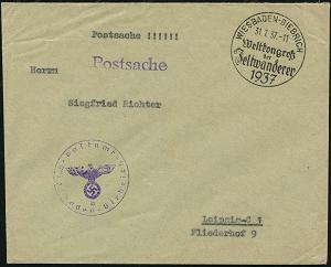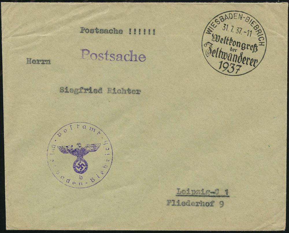 1290 | 20 € | 6200 Wiesbaden Sonder- und Hand-Werbestempel : WIESBADEN-BIEBRICH/ Weltkongreß/ der/ Zeltwanderer 1937 (31.7.) SSt vom Eröffnungstag + viol. HdN: Postamt/b/ Wiesbaden-Biebrich + 1L: Postsache , klar gest. Postdienst-Bf., seltene Verwendung! (Bo.39 , 1. Tag) | ![]() | |