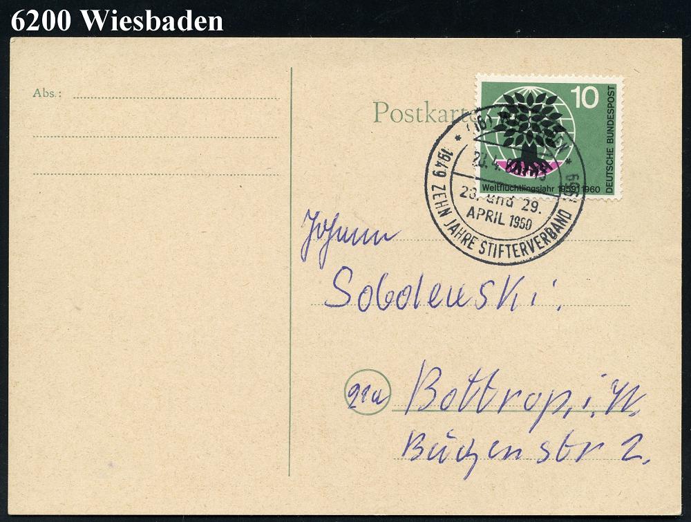1309 | 12 € | 6200 Wiesbaden Sonder- und Hand-Werbestempel : (16) WIESBADEN/ ZEHN JAHRE STIFTERVERBAND 1960 (28.4.) SSt klar auf Inl.-Karte (Bo.97) | ![]() | |