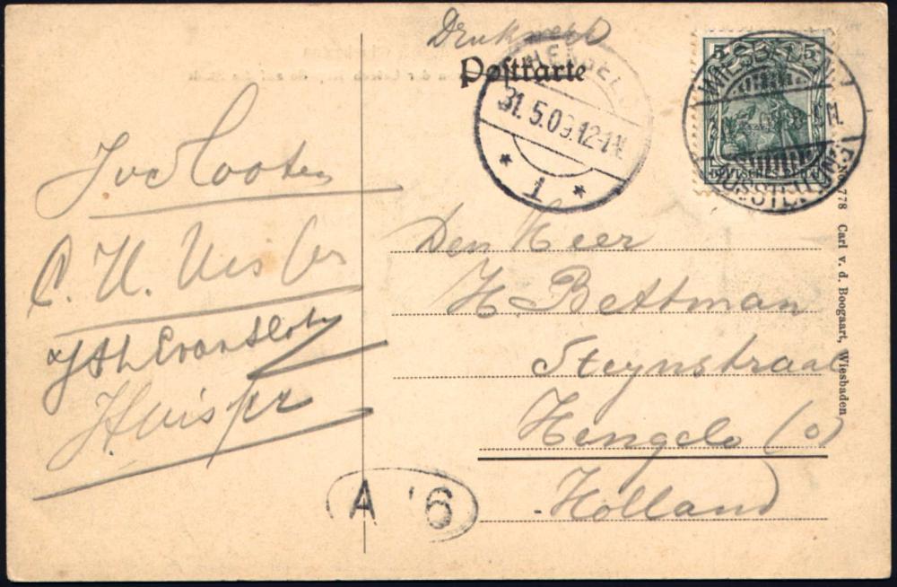 1283 | 28 € | 6200 Wiesbaden Sonder- und Hand-Werbestempel : WIESBADEN/ AUSSTELLUNG 1909 (30.5.) SSt = Ausstellung für Handwerk, Gewerbe, Kunst u. Gartenbau klar gest. s/w.-Ausl.-Ak. (Ortsansicht) Bedarf n. Hengelo, vs. AS. (Bo.5 Ty.I) | ![]() ![]() | |