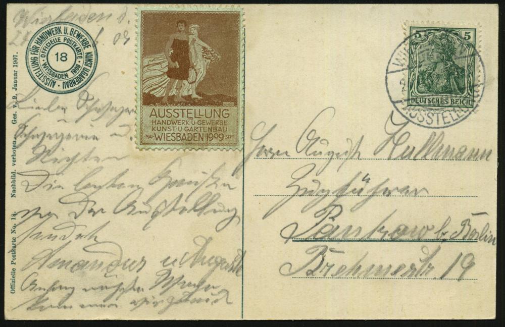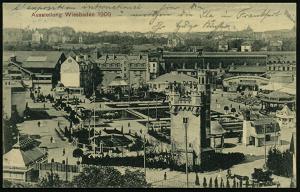 1285 | 30 € | 6200 Wiesbaden Sonder- und Hand-Werbestempel : WIESBADEN/ AUSSTELLUNG 1909 (3.7.) SSt klar auf s/w.-Ausstellungs-Sonder-Kt. Nr. 18 = Ausstellung für Handwerk, Kunst u.Garten + Ausstellungs-Vignette (grün/ braun) Bedarf (Bo.5 , Ty.I = ohne UB) | ![]() ![]() | |