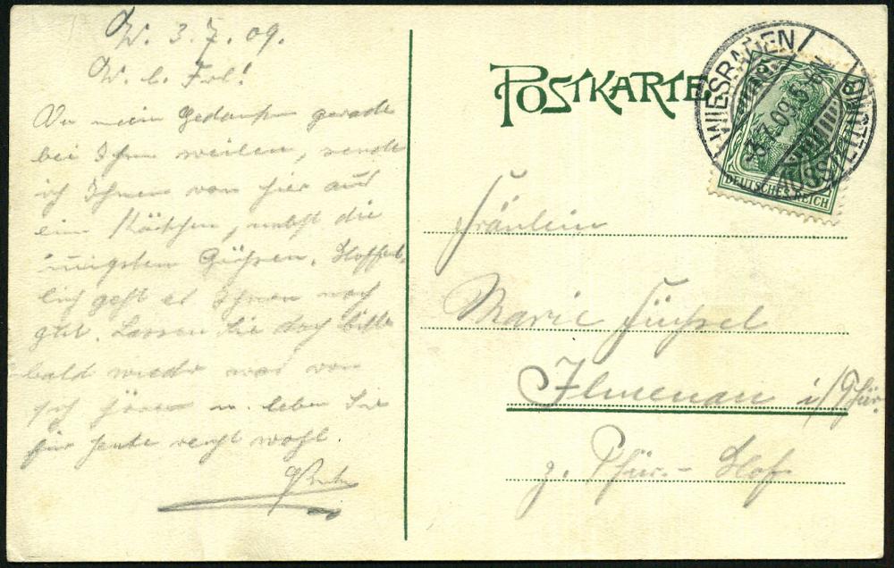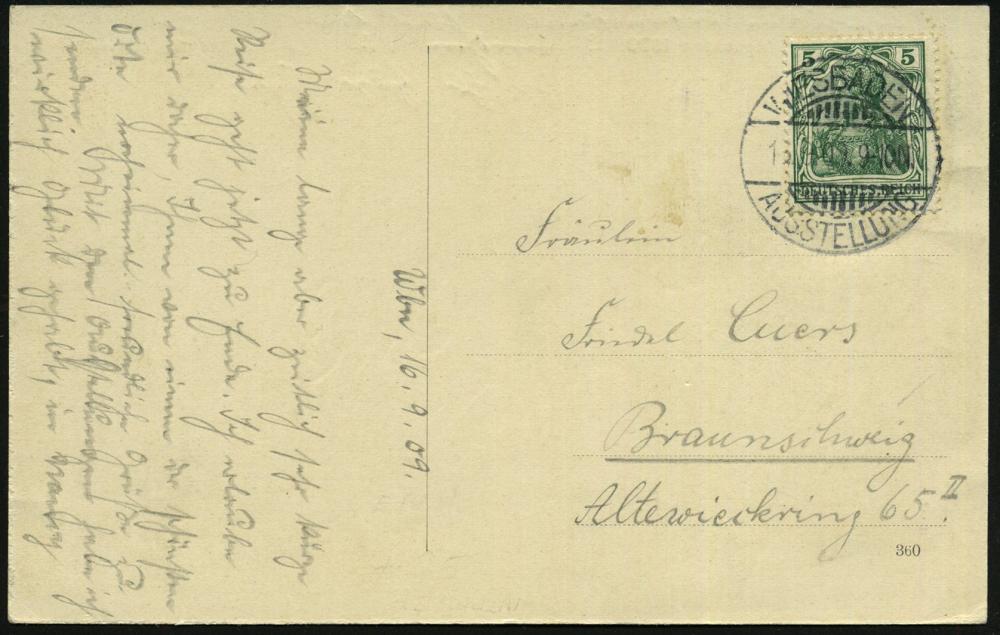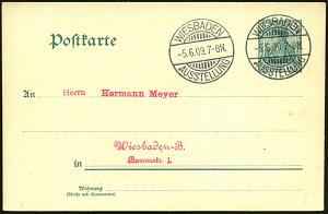 1284 | 20 € | 6200 Wiesbaden Sonder- und Hand-Werbestempel : WIESBADEN/ AUSSTELLUNG 1909 (5.6.) SSt = Ausstellung für Handwerk, Gewerbe, Kunst u. Gartenbau , 2x glasklar gest. Orts-P. 5 Pf. Germania (Bo.5 Ty.I = ohne UB) | ![]() | |