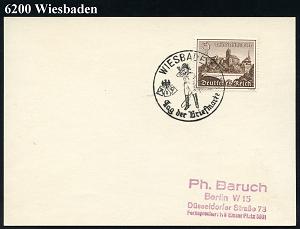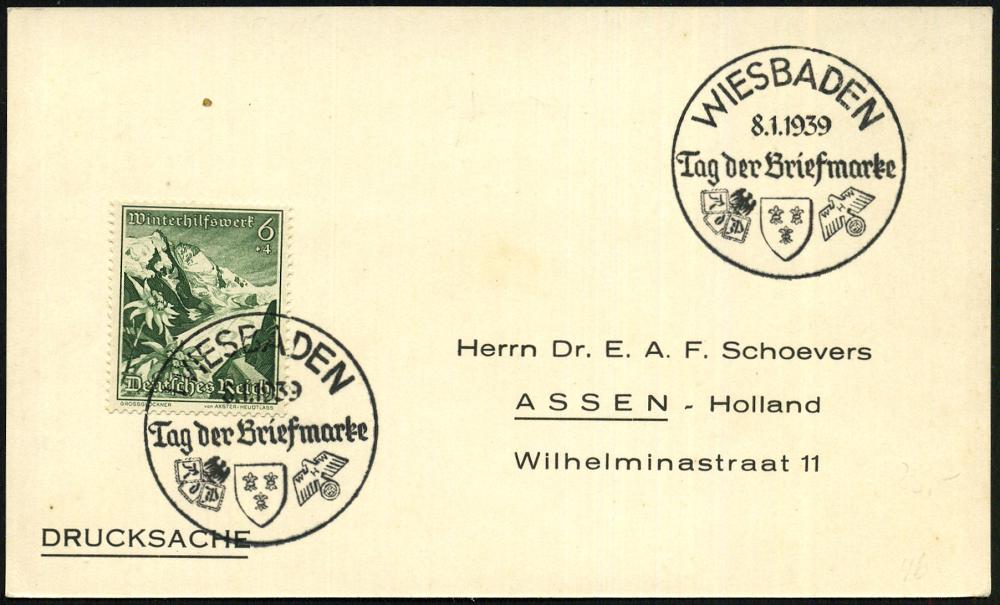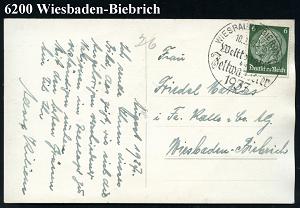 1296 | 16 € | 6200 Wiesbaden Sonder- und Hand-Werbestempel : WIESBADEN/ Tag d.Briefmarke 1939 (8.1.) SSt (RdPh u. WHW-Logo) auf EF 6 + 4 Pf. WHW., klar gest. Ausl.-Karte (Bo.46) | ![]() | |