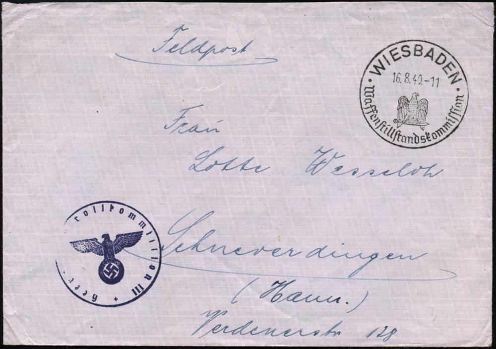 1298 | 25 € | 6200 Wiesbaden Sonder- und Hand-Werbestempel : WIESBADEN/ Waffenstillstandskommission 1940 (16.8.) früher HWSt + HdN: Heereskontrollkommission III (links gering undeutl.) hs. Abs.: Unterkommission Heer..Nassauischer Hof = (Waffenstillstand mit Frankreich) Feldpost-Bf. n. Schneverdingen (Bo.51 ,Erstjahr, Frühdatum!) | ![]() ![]() | |