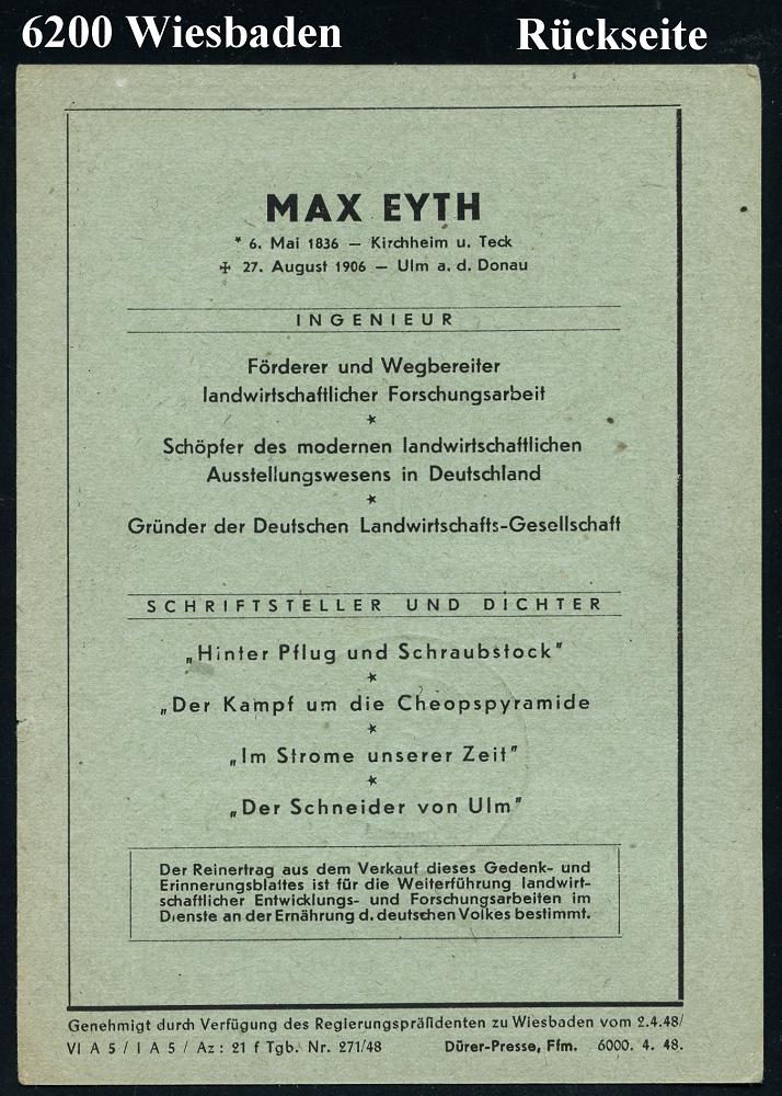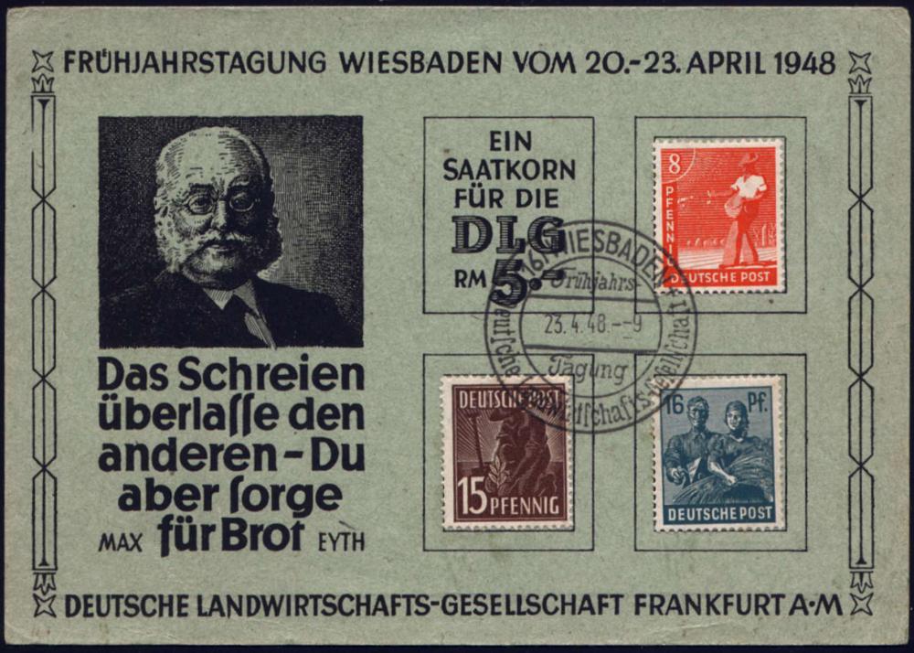 1300 | 18 € | 6200 Wiesbaden Sonder- und Hand-Werbestempel : (16) WIESBADEN/ Frühjahrs-/ Tagung/ Deutsche Landwirtschafts-Ges. 1948 (Apr.) SSt klar auf Spenden-Gedenkblatt DLG 5.- RM ,Abb. + rs. Text: Max Eyth, Gründer der DLG, Erfinder des Dampfpfluges, Schriftsteller "Der Schneider v.Ulm" (Bo.58) | ![]() ![]() | |