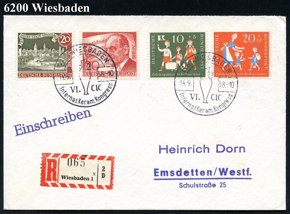 1302 | 20 € | 6200 Wiesbaden Sonder- und Hand-Werbestempel : (16) WIESBADEN/ VI.CIC/ Internat.Keram.Kongress 1958 (14.9.) seltener SSt (Keramik-Amphore) 2x + RZ: Wiesbaden 1/x ohne PLZ, Inl.-R-Bf. (Bo.83) | ![]() | |