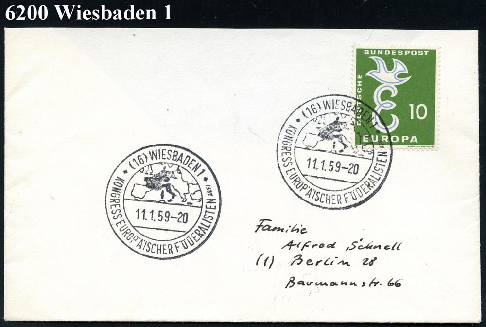 1303 | 12 € | 6200 Wiesbaden Sonder- und Hand-Werbestempel : (16) WIESBADEN 1/ KONGRESS EUROP.FÖRDERALISTEN 1959 (Jan.) SSt = Europa-Karte , CEPT-Frankatur, klar gest. Inl.-Bf. (Bo.85) | ![]() | |