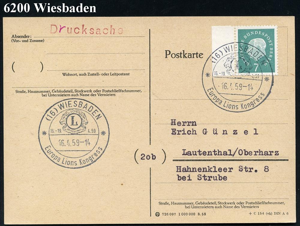 1305 | 12 € | 6200 Wiesbaden Sonder- und Hand-Werbestempel : (16) WIESBADEN/ Europa Lions Kongress 1959 (16.4.) SSt (Lions-Logo) klar gest. Inl.-Karte (Bo.88) | ![]() | |