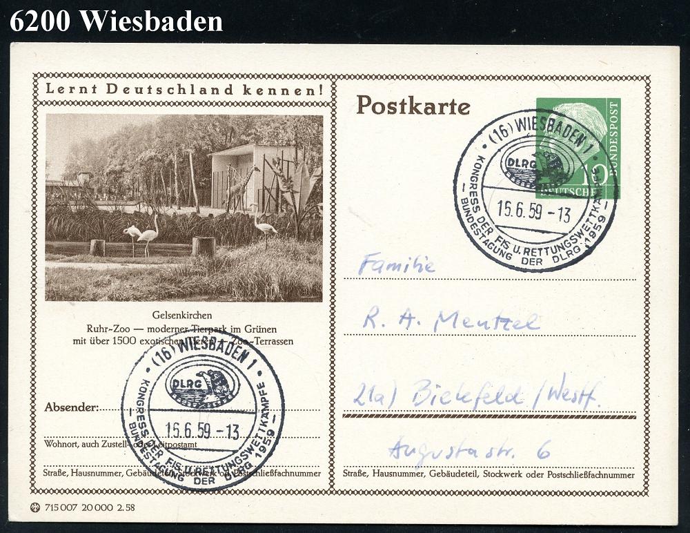 1306 | 15 € | 6200 Wiesbaden Sonder- und Hand-Werbestempel : (16) WIESBADEN 1/ DLRG/ KONGRESS DER FIS U. RETTUNGSWETTKÄMPFE.. 1959 (15.6.) seltener SSt = DLRG-Logo (Adler = Deutsche Lebens-Rettungs-Gesellschaft) Inl.-Karte (Bo.89, Finaltag) | ![]() | |
