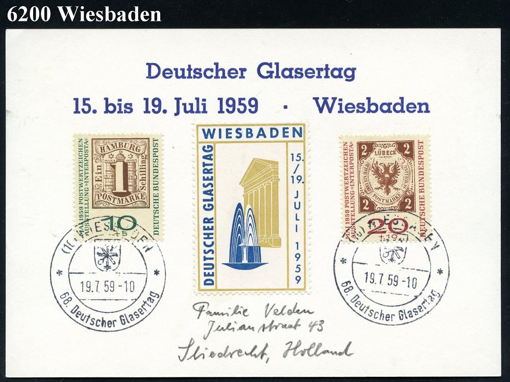 1307 | 25 € | 6200 Wiesbaden Sonder- und Hand-Werbestempel : (16) WIESBADEN/ 68.Dt.Glasertag 1959 (19.7.) SSt = Wappen der Glaser-Innung + Color-Vignette, rs. auf Sonder-Kt. "Deutscher Glasertag" (Michaelis unbekannt!), Ausl.-Kt. n. Holland (Bo.91 , Finaltag) | ![]() | |