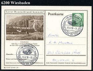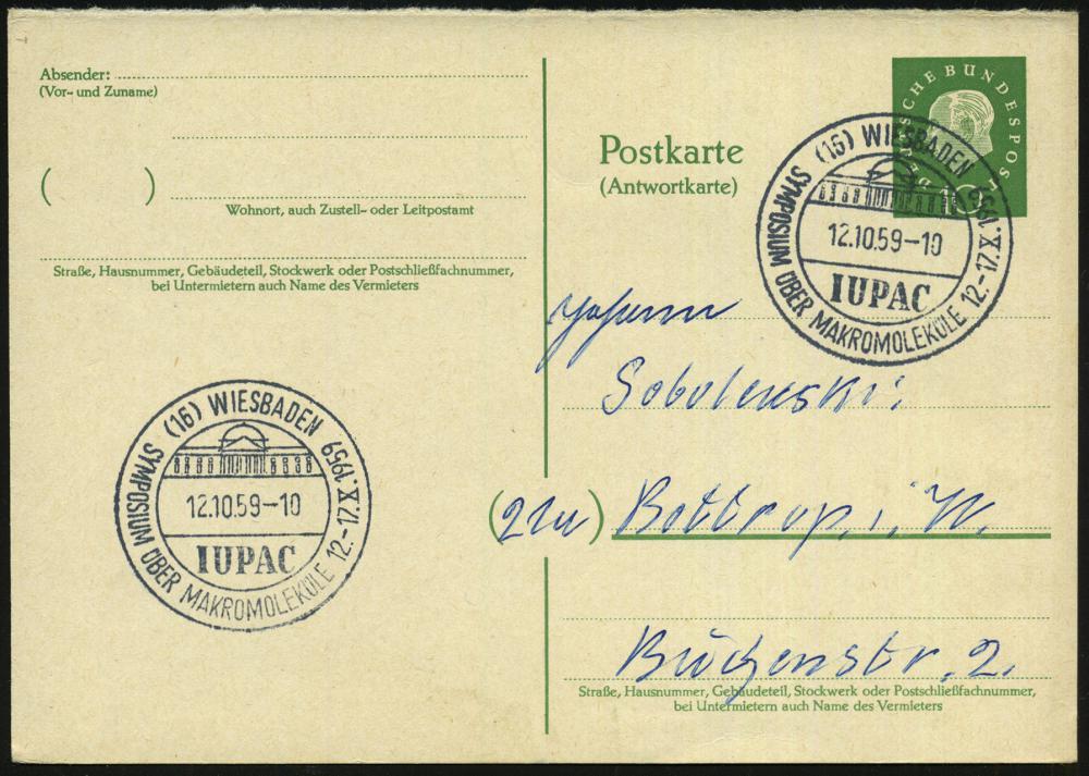 1308 | 14 € | 6200 Wiesbaden Sonder- und Hand-Werbestempel : (16) WIESBADEN/ IUPAC/ SYMPOSIUM ÜBER MAKROMOLEKÜLE 1959 (12.10.) SSt (Kurhaus) auf Antwort-P 10 Pf. Heuss III (Bo.95) | ![]() | |