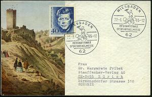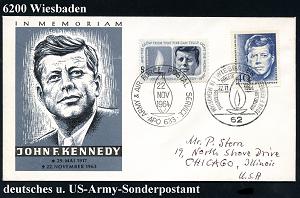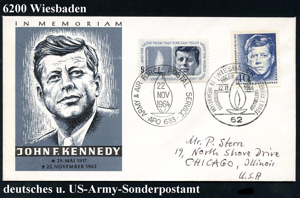 1312 | 18 € | 6200 Wiesbaden Sonder- und Hand-Werbestempel : 6200 WIESBADEN/ IN MEMORIAM JOHN F KENNEDY 1964 (22.11.) SSt = ewige Flamme auf MiF 40 Pf. Kennedy (Berlin Mi.241) + Omnibus-Ausgabe 5 C. "Kennedy" (USA Mi.860) motivgl. Feldpost-SSt: APO 633 = Wiesbaden, Übersee-FDC, (Bo.143) | ![]() | |