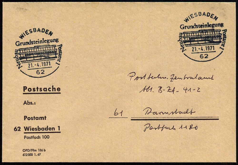 1319 | 12 € | 6200 Wiesbaden Sonder- und Hand-Werbestempel : 62 WIESBADEN/ Grundsteinlegung/ Neues Postamt 1971 (21.4.) SSt = Postamt auf Post-Dienstbf.: Postamt 62 Wiesbaden 1.. | ![]() | |