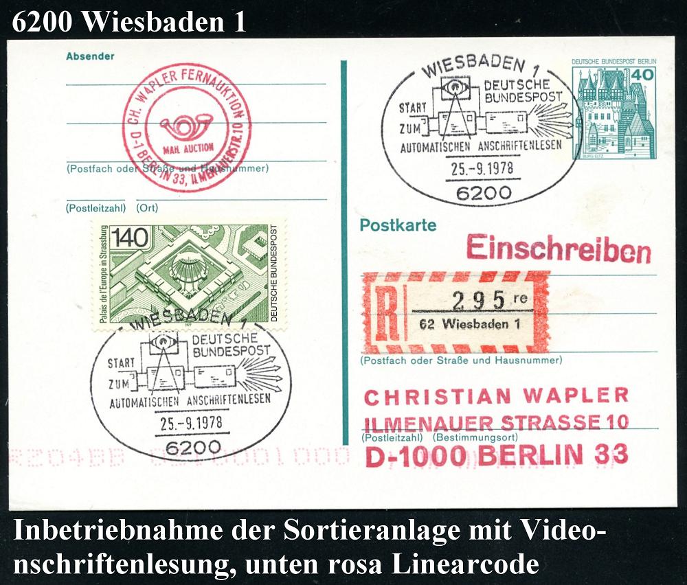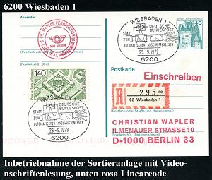 1323 | 16 € | 6200 Wiesbaden Sonder- und Hand-Werbestempel : 6200 WIESBADEN 1/ DEUTSCHE/ BUNDESPOST/ START/ ZUM/ AUTOMATISCHEN ANSCHRIFTENLESEN 1978 (25.9.) SSt = Video-Codierung 2x + RZ: 62 Wiesbaden 1/r e + rosa Versuchs-Linear-Code, Inl.-R-Kt. für PLZ 1000 (West)-Berlin (Bo.246) | ![]() | |