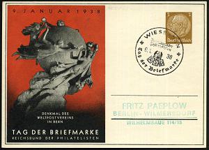 1293 | 20 € | 6200 Wiesbaden Sonder- und Hand-Werbestempel : WIESBADEN/ RdPh/ Tag d.Briefmarke 1938 (9.1.) SSt auf PP 3 Pf. Hindenbg., braun: TAG DER BRIEFMARKE.. = UPU-Denkmal r o t (Mi. PP 122/C 70-02) klar gest. Inl.-Kt (Bo.42) | ![]() | |