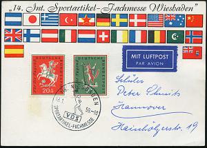 1313 | 14 € | 6200 Wiesbaden Sonder- und Hand-Werbestempel : 62 WIESBADEN/ INTERNAT./ SPORTARTIKELMESSE 1965 (22.3.) SSt = Sportler ( mit Lorbeer u. Olymp. Ringen) 2x auf Ausl.-Bf. (Bo.145) | ![]() | |