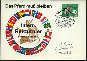 1315 | 16 € | 6200 Wiesbaden Sonder- und Hand-Werbestempel : 6202 WIESBADEN-BIEBRICH/ 16.-18.5./ INT./ REITTURNIER 1970 (17.5.) SSt = Reiterkappe (u.a. Reiter-Accessoires) klar gest. motivgleicher Sonder-Kt.! (Bo.194) | ![]() | |