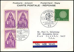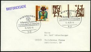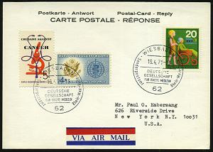 1318 | 18 € | 6200 Wiesbaden Sonder- und Hand-Werbestempel : 62 WIESBADEN/ DEUTSCHE/ GESELLSCHAFT/ FÜR INNERE MEDIZIN/ Sonderpostamt Rhein.Main-Halle 1971 (16.4.) SSt auf MiF 20 Pf. BRD Pflegehilfe (Mi.631) + USA 4 C. Malaria u. 5 C. Krebs-Bekämpfung (Mi.823, 878) zulässige Antwort-Übersee-Flp.-Kt. n.New York!, Unikat! | ![]() | |