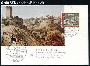 1314 | 15 € | 6200 Wiesbaden Sonder- und Hand-Werbestempel : 6202 WIESBADEB-BIEBRICH/ INTERNAT./ PFINGSTTURNIER 1965 (7.6.) SSt = Reiterkappe etc. (zum Reitturnier) 2x klar gest. individueller, illustrierter Ausl.-Bf. (Burgruine Sonnenberg) (Bo.150) | ![]() | |