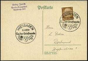 1295 | 12 € | 6200 Wiesbaden Sonder- und Hand-Werbestempel : WIESBADEN/ Tag der Briefmarke 1939 (8.1.) SSt = Stadtwappen, WHW-Logo etc., klar gest. Inl.-Karte (Bo.46) | ![]() | |