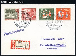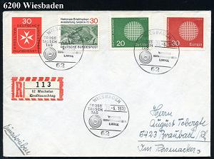 1317 | 20 € | 6200 Wiesbaden Sonder- und Hand-Werbestempel : 62 WIESBADEN/ GROSS/ TAUSCH/ TAG.. 1970 (20.6.) 3x SSt + Sonder-RZ: 62 Wiesbaden/Großtauschtag (NEZ-Nr.34) , Inl.-R-Bf., Aufl. nur 385 R-Belege (Bo.197) | ![]() | |