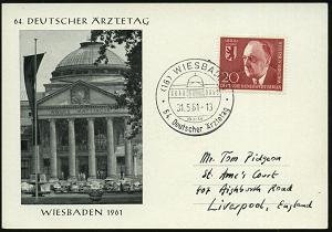 1310 | 16 € | 6200 Wiesbaden Sonder- und Hand-Werbestempel : (16) WIESBADEN/ 64.Deutscher Ärztetag 1961 (31.5.) SSt (Kurhaus) klar gest., motivgl. Sonder-Kt.! (Kurhaus) Ausl.-Kt. (Bo.107) | ![]() | |